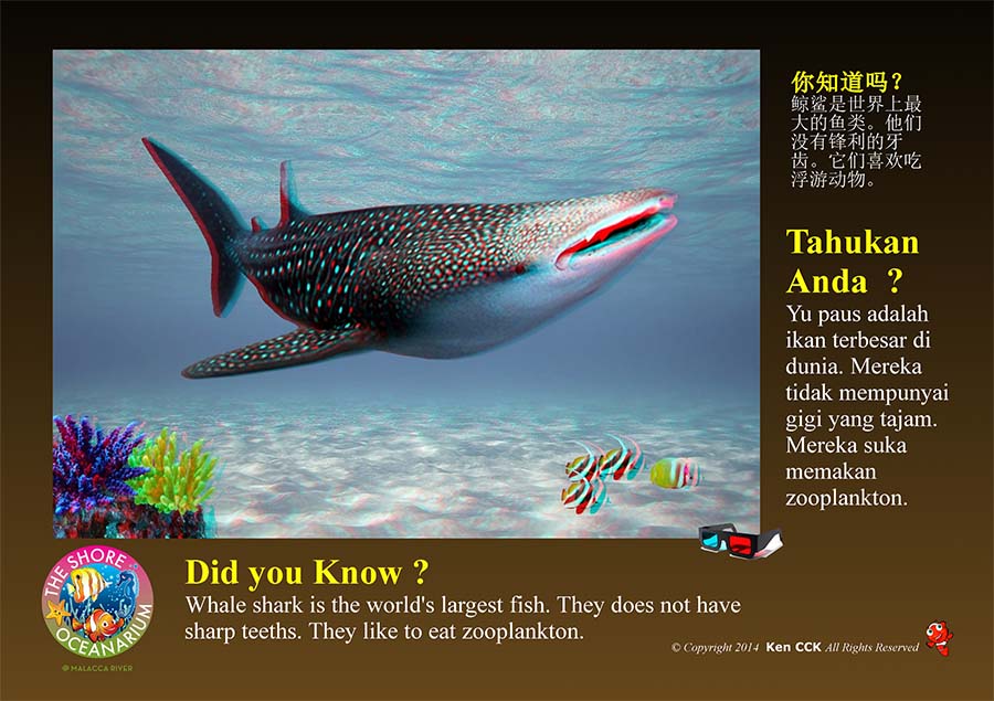 It's taking the learning journey to the next dimension. With 3-D glasses you will be able to have “Like Real Vision” of different places and species. Such as you can see the Mangrove Tree in Malacca River, Pahang Rainforest, Sungai Perak in 3D, fossil stone in 3D and some extinct fish species in 3D light board display. Starting June 2015 the management had obtain copyright of a documentary movie " A turtle's Adventure" in HD 3D to be played in the Oceanarium. Now the this Documentary 3D movie had further upgrade to 3D Plus Cinematic Enhanced Experience with special effect of Wind, Bubble, Lightning, Smoke......& other special effects (**Terms & Conditions Apply)